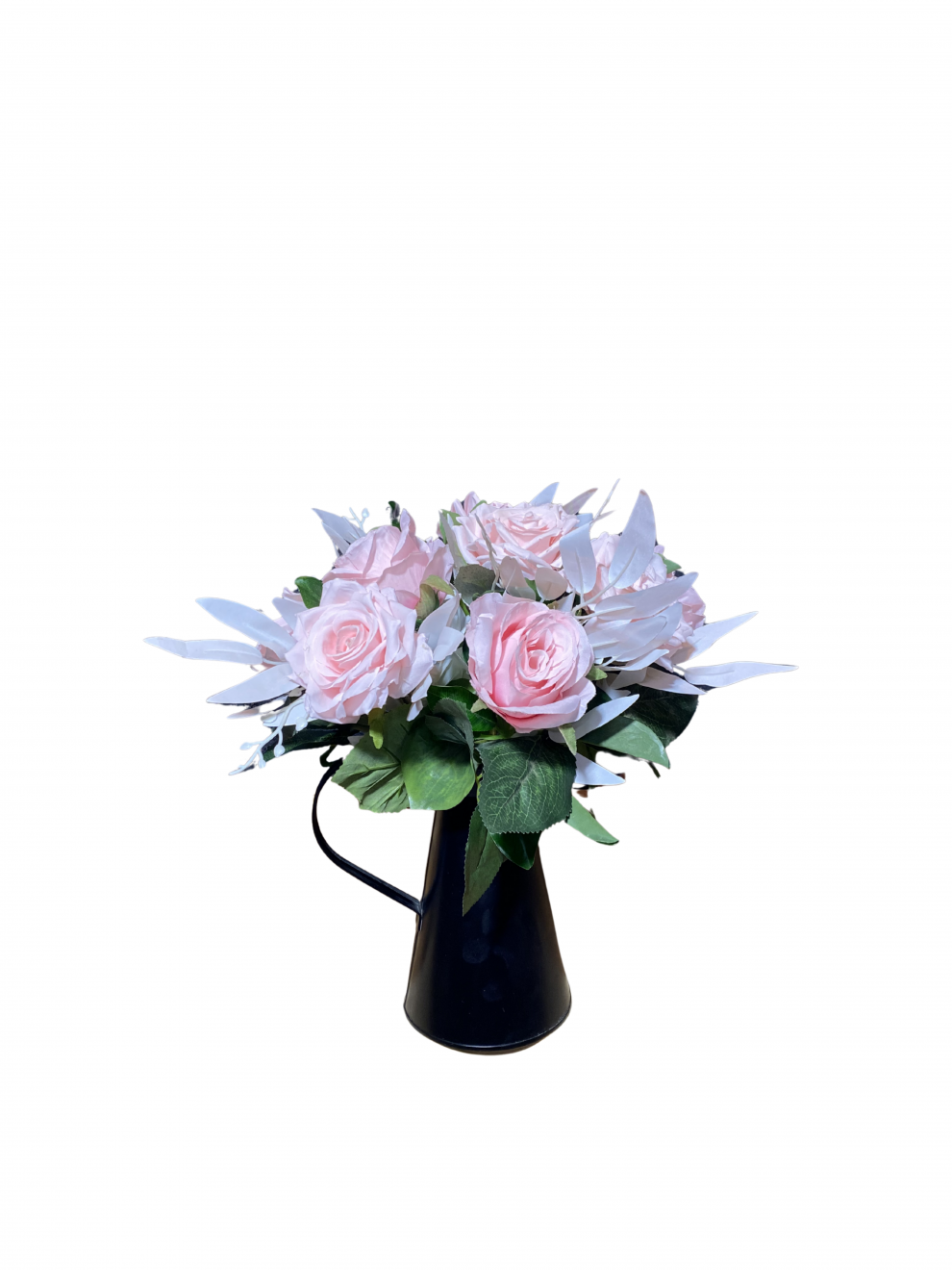 Pudra pembe güllerin siyah modern vazo ile buluştuğu zarif ve şık yapay çiçek aranjmanı.