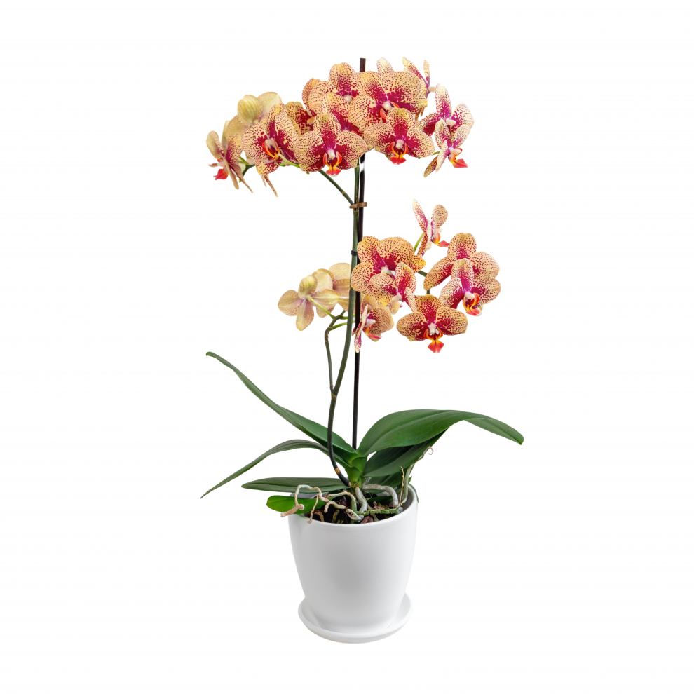 Selin Çiçek tarafından özenle hazırlanan çift dallı sarı kırmızı benekli orkide, dekoratif beyaz seramik saksısı ve dolgun çiçek yapısıyla bulunduğu ortama canlılık katar.