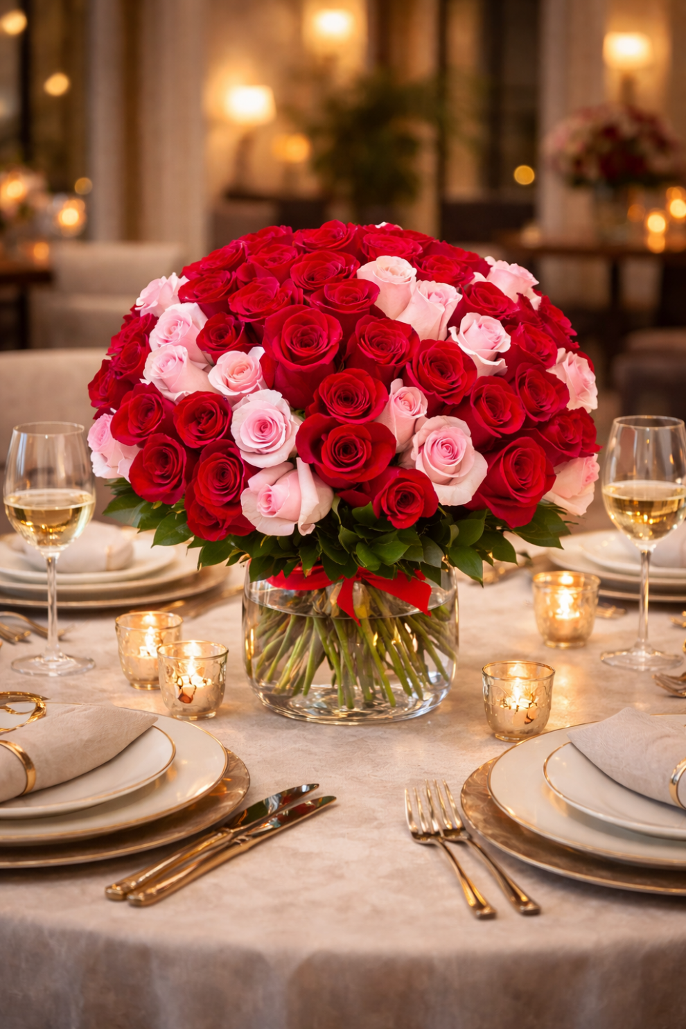 Kırmızı ve pembe güllerin bir araya gelmesiyle hazırlanan bu zarif çiçek aranjmanı; romantik sofralar, özel davetler ve şık yemek organizasyonları için ideal bir masa çiçeğidir. Cam vazoda hazırlanan bu tasarım, sıcak ışıklar ve masa dekoru ile birleştiğinde bulunduğu ortama sofistike ve romantik bir atmosfer kazandırır. Çiçek Cumhuriyeti tarafından hazırlanan bu özel gül aranjmanı; yıl dönümü yemekleri, evlilik teklifleri, romantik akşam yemekleri ve özel davet sofraları için tercih edilen şık bir çiçek tasarımıdır. Kırmızı ve pembe güllerin uyumu sayesinde mekâna hem zarafet hem de romantik bir ambiyans kazandırır.