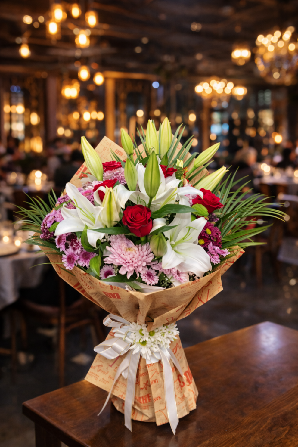 Beyaz lilyumlar, kırmızı güller ve pembe krizantemlerin uyumuyla hazırlanan bu zarif çiçek buketi; şık görünümü ve etkileyici çiçek kombinasyonu ile dikkat çeken özel bir tasarımdır. Lilyumun asil beyaz dokusu ve kırmızı gülün romantik anlamı sayesinde hem zarif hem de güçlü bir hediye seçeneği sunar. Çiçek Cumhuriyeti tarafından hazırlanan bu özel çiçek buketi; doğum günü, sevgililer günü, yıl dönümü ve özel kutlamalar için tercih edilebilecek estetik bir aranjmandır. Modern ambalaj tasarımı ve taze çiçeklerin doğal güzelliği sayesinde bulunduğu ortama şıklık ve zarafet katar.