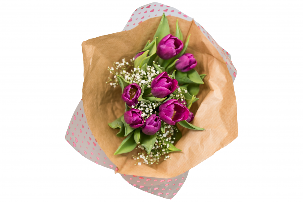 Selin Çiçek tasarımı Mor Lale Buketi; taze mor laleler ve cipso çiçekleriyle hazırlanmış, doğal kraft ambalajıyla sunulan modern bir bukettir. Minimal tarzı sevenler için sade ama etkileyici bir seçenektir.