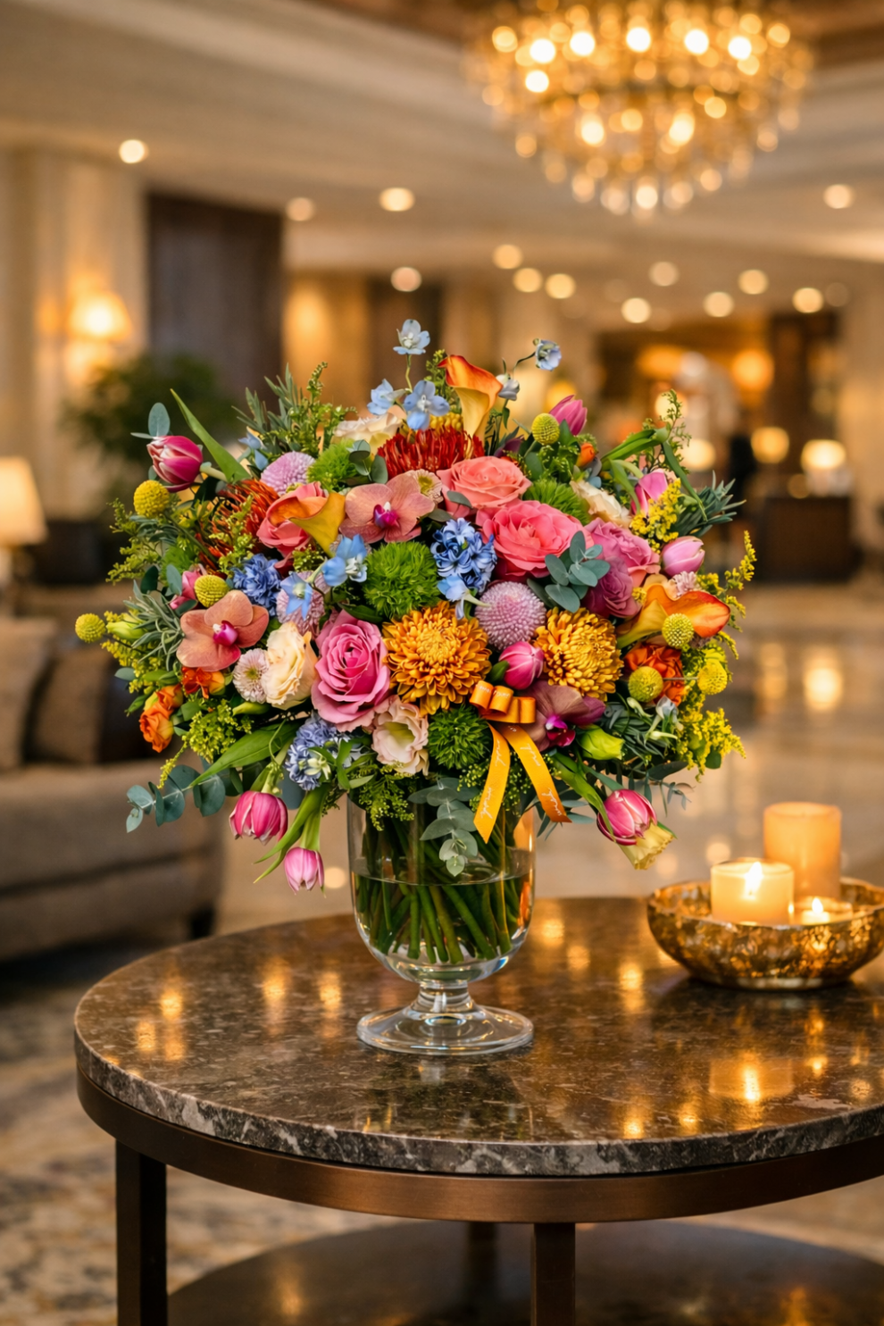 Canlı renklerin uyumu ile hazırlanan bu özel çiçek aranjmanı; güller, orkide, krizantem, lale ve mevsim çiçeklerinin zarif birleşimiyle tasarlanmıştır. Otel lobileri, restoran girişleri ve prestijli mekan dekorasyonları için ideal olan bu tasarım; bulunduğu ortama şıklık ve canlılık katar. Çiçek Cumhuriyeti tarafından hazırlanan bu aranjman, özel günlerde veya mekan dekorasyonlarında dikkat çekici bir atmosfer oluşturur.