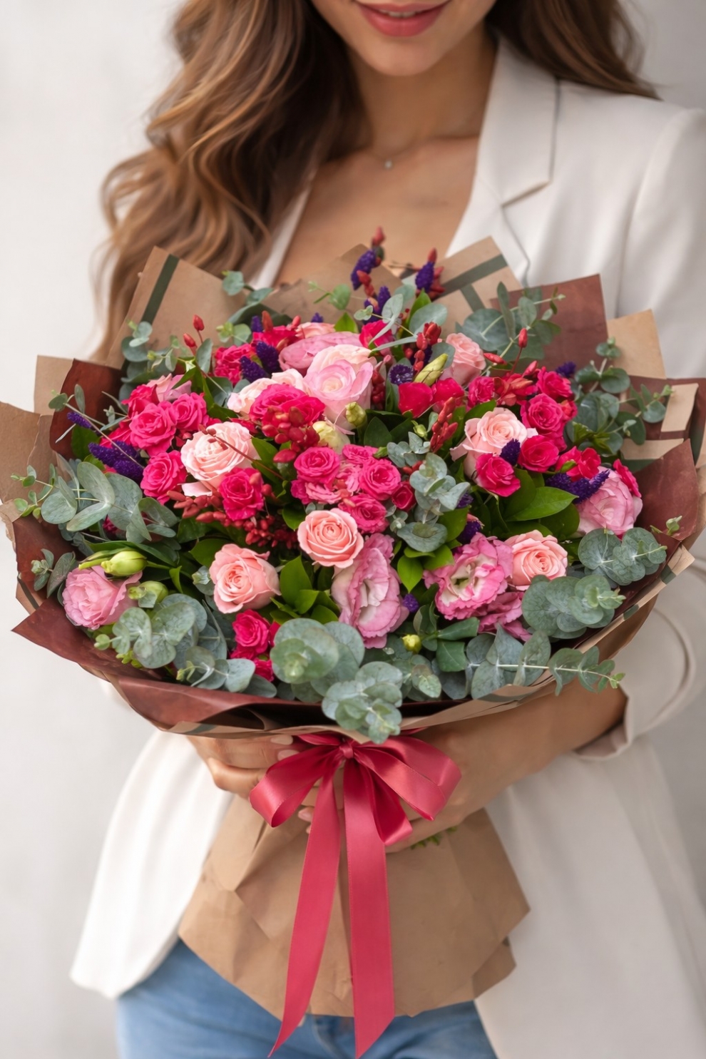 Pembe ve fuşya tonlarındaki güller, zarif yeşillikler ve doğal dokularla hazırlanan bu romantik buket; sevgi, zarafet ve mutluluğu ifade eden özel bir çiçek tasarımıdır. Modern ambalajı ve canlı renkleri sayesinde hem etkileyici bir hediye hem de şık bir sunum oluşturur.