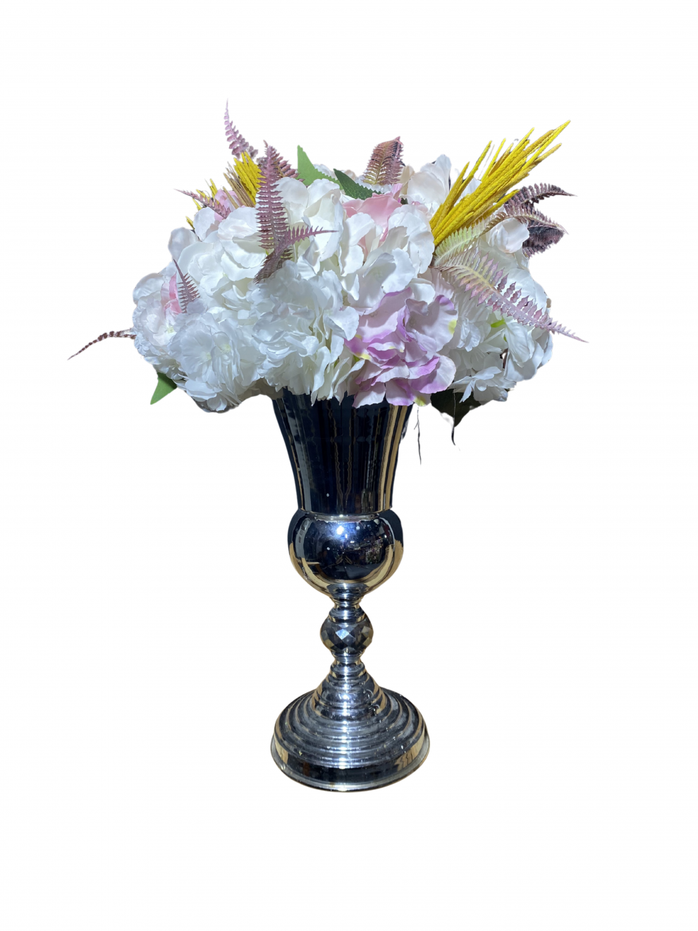 Gümüş ayaklı vazoda beyaz ortanca ve soft pembe detaylarla tasarlanmış modern luxury yapay aranjman.