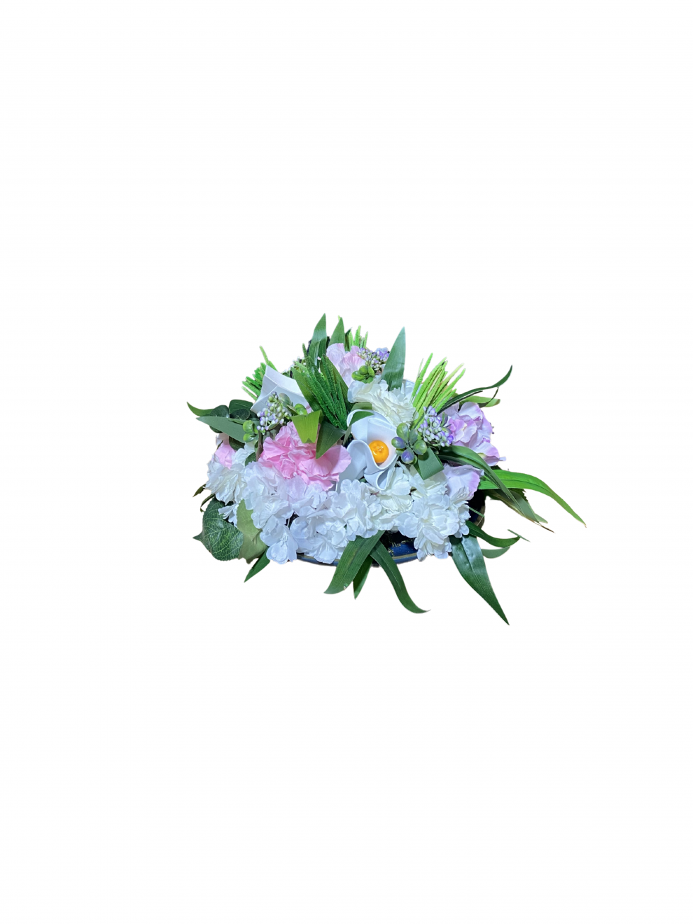Soft pembe ve beyaz tonlarda hazırlanan bu yapay çiçek aranjmanı; doğal görünümlü ortanca, karanfil ve dekoratif yeşilliklerle tasarlanmıştır.