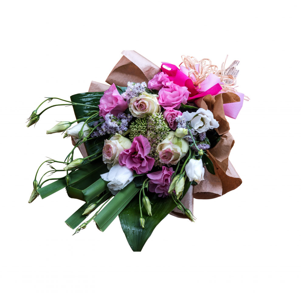 Selin Çiçek imzası taşıyan soft pembe gül buketi; taze pembe güller, lisyantus ve mevsim çiçekleriyle hazırlanarak doğal yeşillikler eşliğinde kraft ambalajla sunulur.