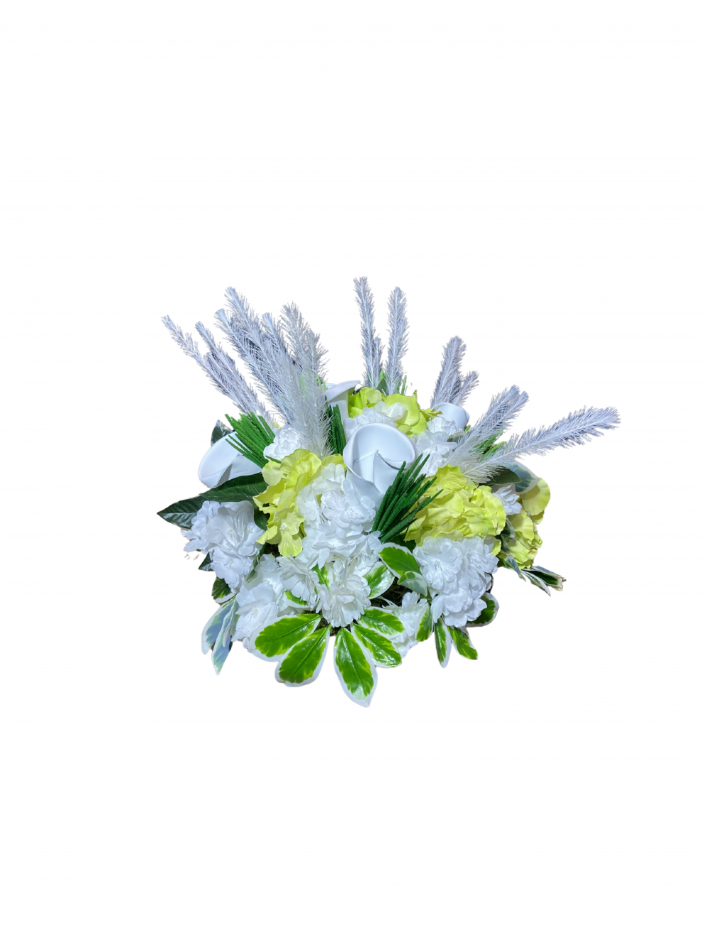 Beyaz ve açık yeşil tonlu çiçekler, dekoratif yapraklar ve minimal dokulu tamamlayıcı bitkilerle tasarlanmıştır. Dengeli formu sayesinde hem klasik hem modern mekanlarda rahatlıkla kullanılabilir.