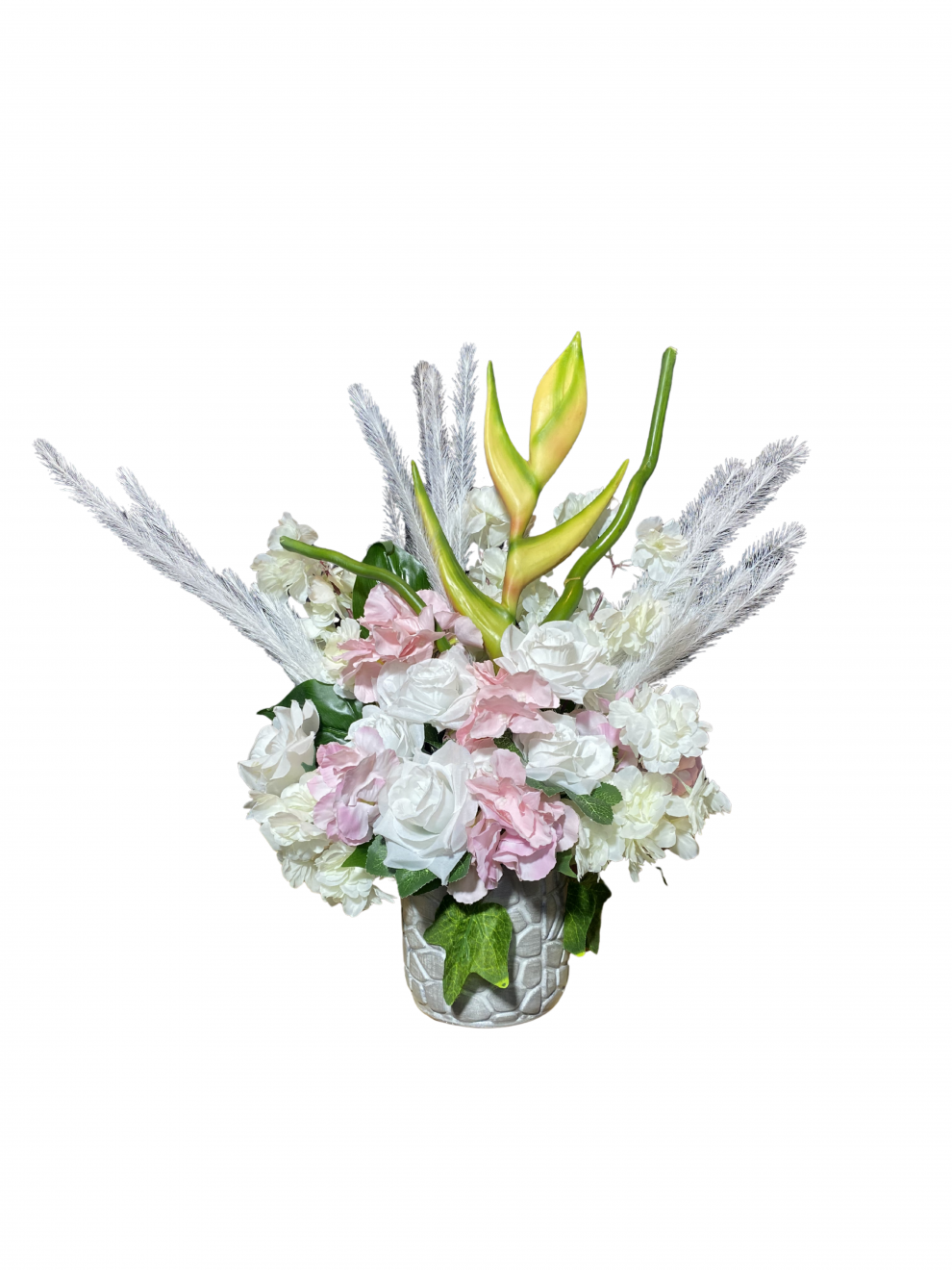 Beyaz ve soft pembe çiçeklere tropikal detayların eşlik ettiği lüks yapay aranjman.