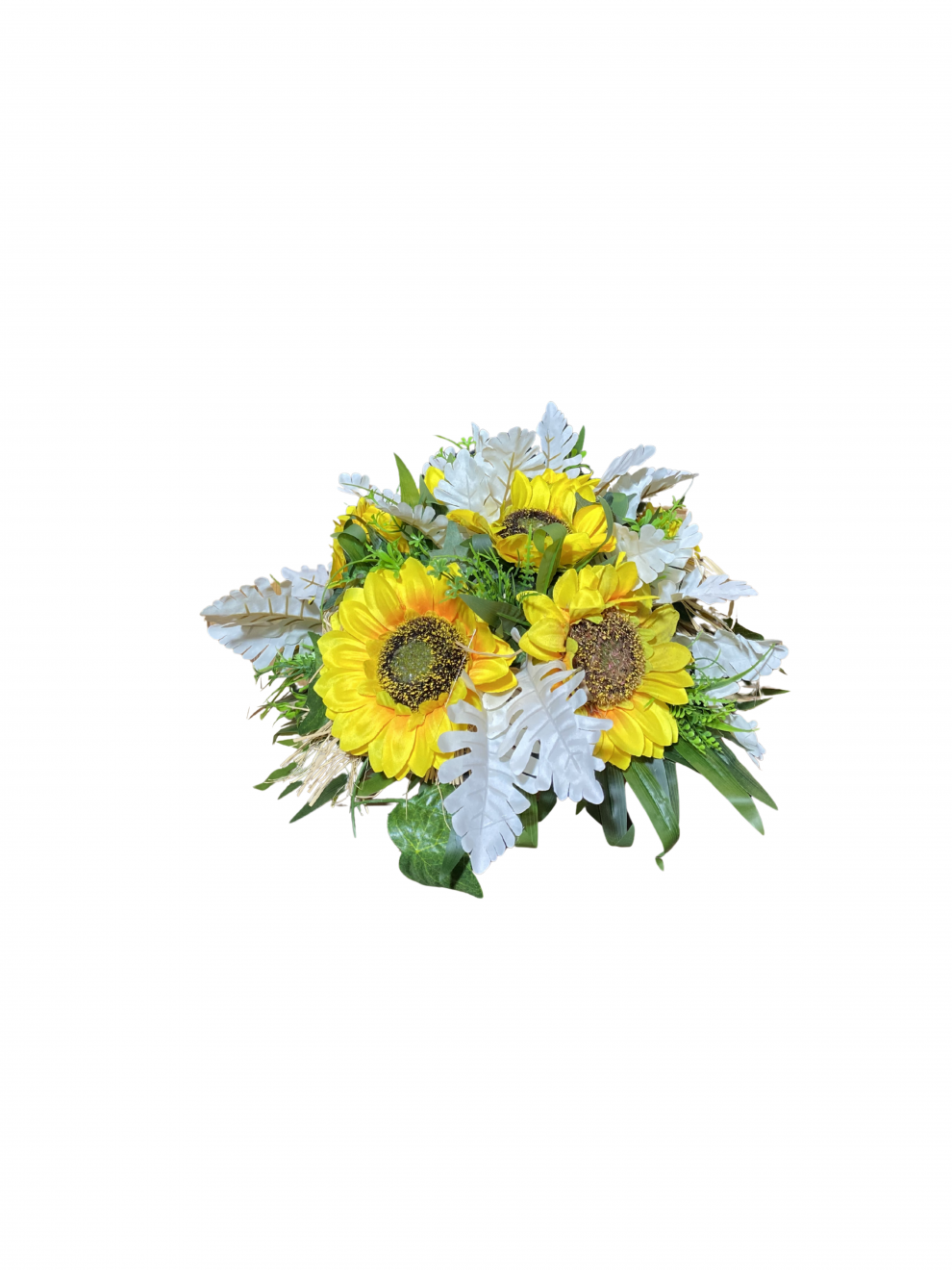 Doğal görünümlü sarı ayçiçekleri, dekoratif yaprak detayları ve yeşil dolgu bitkileriyle hazırlanmıştır. Mekana canlılık ve pozitif bir atmosfer katar.